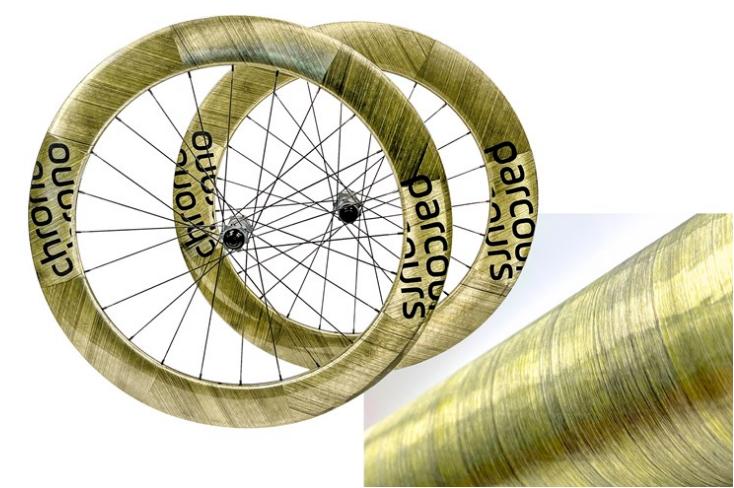 Hypetex(英国伦敦)在2023年4月21-23日在伦敦亚历山大宫举行的2023年自行车展上首次推出了据称是世界上第一套彩色碳纤维复合材料自行车轮。据该公司称,与车轮品牌Parcours(法国巴黎)合作开发的Chrono碳纤维车轮采用了Hypetex的Zlatan单向(UD)碳纤维材料制成的金色饰面,与传统的涂装替代产品相比,具有高度的美感、轻质和高性能。Hypetex针对先进材料(如碳纤维)的可持续着色技术是一种专利的油漆替代工艺,诞生于一级方程式赛车。结合水基生态树脂和可持续的固化过程,Hypetex材料具有大胆、多彩的美感,以及技术和成本节约的优势。