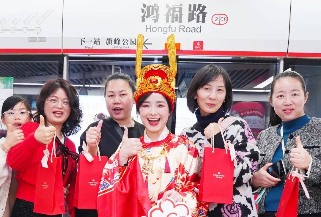 一位“女财神”在东莞地铁2号线鸿福站派发礼物后和市民合影留念。当日,由钻石世家与东莞报业传媒集团联合举办的“香遇好运”东莞地铁新春礼活动在此盛大开启,为市民们送上了一份独特而温馨的新年礼物。