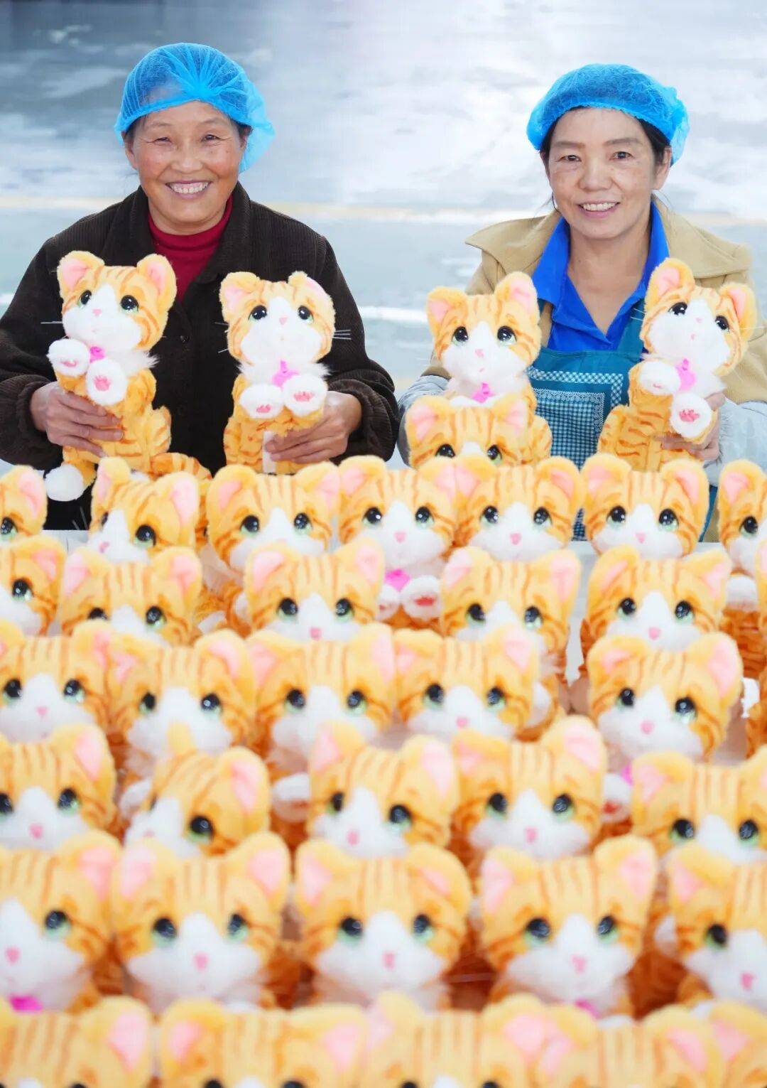 流水线日,铜仁市松涛县巧积玩具公司,两位女工在展示她们生产好点猫咪玩具。莞铜协作坚持“产业先行”,推进“东莞总部+铜仁基地”的产业模式。莞铜携手在各安置点周边累计推动建设产业园区、帮扶车间、社区工厂、学校等各类项目139个,带动受益群众约19.78万人。