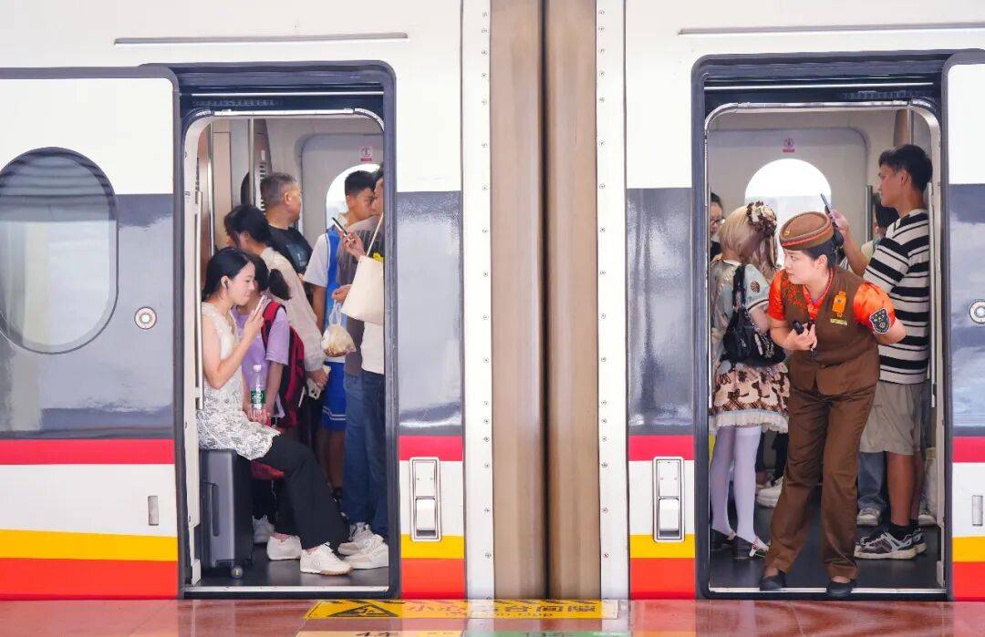 “双节”迎送70.4万人次2025年10月2日,东莞虎门高铁站,一位列车值班员正在查看车门口的旅客进站情况。