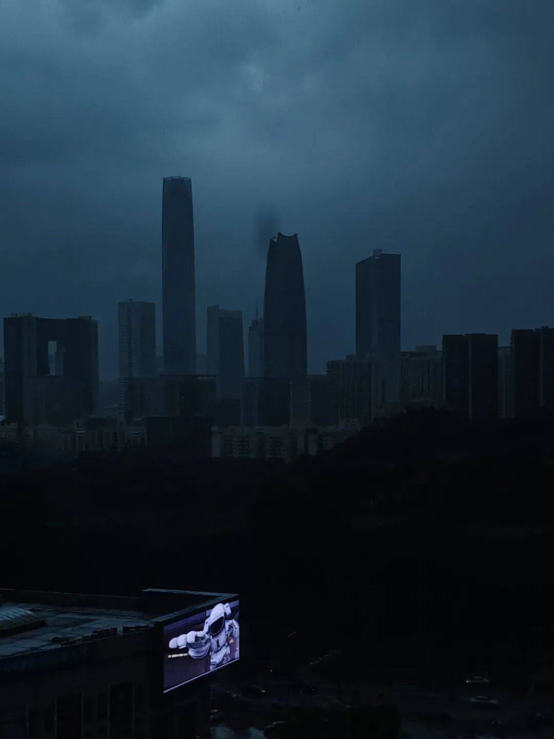 2025年4月12日,广东东莞,大雨来临前,“太空使者”从城市建筑大屏上即将走出。