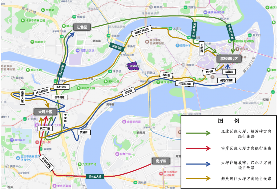 3.大坪→江北区:建议经经纬大道→虎头岩隧道→华村立交→嘉华大桥→江北片区;