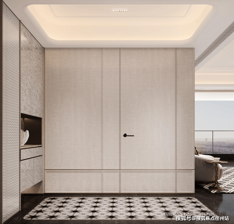 极具仪式感的归家门头,更复杂的肌理铜板吊顶、宝格绿奢石门套与定制化蚀刻纹样,通过视觉、触觉的不同感官感受,完成了归家的身份转换。