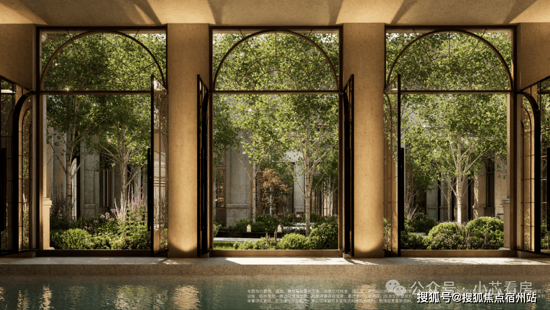 NO.8 花园泳池波光潋滟处,拱形门窗外花影摇曳,一池春水将四季芳菲溶成流动的油画。