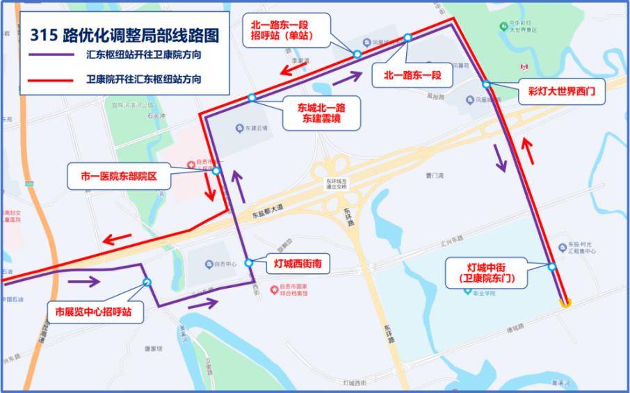 (三)315路线.现线路走向:汇东公交枢纽站—客运总站—兴达数码广场—市政府—广电大厦—泰丰大厦—蜀光中学—三八路—东源半岛—和平小学—文化艺术中心—市展览中心招呼站—市档案馆招呼站—汇兴东路招呼站—德铭路招呼站—卫康院—灯城中街—彩灯大世界西门—北一路东一段—北一路东一段招呼站—柑子坳—文化艺术中心—和平小学—东源半岛—三八路—蜀光中学—泰丰大厦—广电大厦—市政府—兴达数码广场—自贡电信—丹桂大街中段—交通苑—南湖国际社区—汇东公交枢纽站