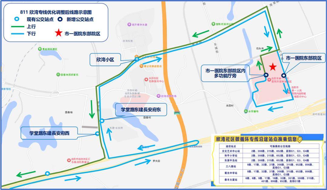此外,811路社区巴士的起讫点之一调整至“市一医院东部院区”,并在院内设置上下车点,为市民就医提供便利。两条连接高铁站与中心城区的高铁快线路,部分班次也将覆盖医院东部院区,方便搭乘高铁的旅客及市民就医往返。