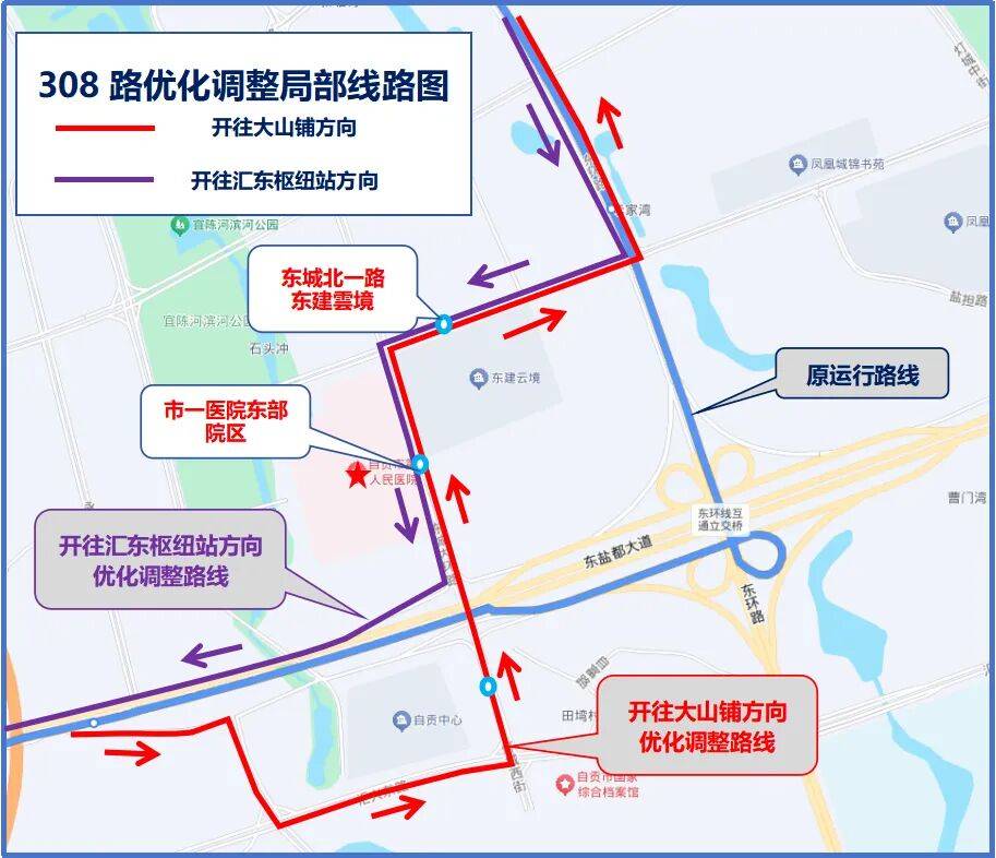 此次调整主要围绕东部院区增设站点、优化走向。其中,306路在上下行中均新增“市一医院东部院区”及“东城北一路东建雲境”等站,部分班次还将绕行沿滩新城以扩大服务范围。308路在往返方特恐龙王国方向时,也将经停医院新设站点。315路由此前的部分循环线路优化为明确的上、下行往返线路,直接连接汇东片区与市一医院东部院区及彩灯大世界区域。